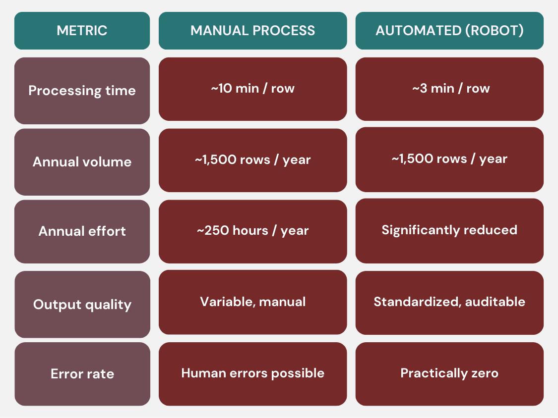The automation delivered clear and measurable business value, both in terms of time savings and operational quality.